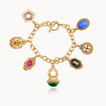 The bracelet features a vintage gold-plated finish, adding an elegant, timeless touch. It is crafted with a combination of natural crystals and natural stones to correspond with the chakras: