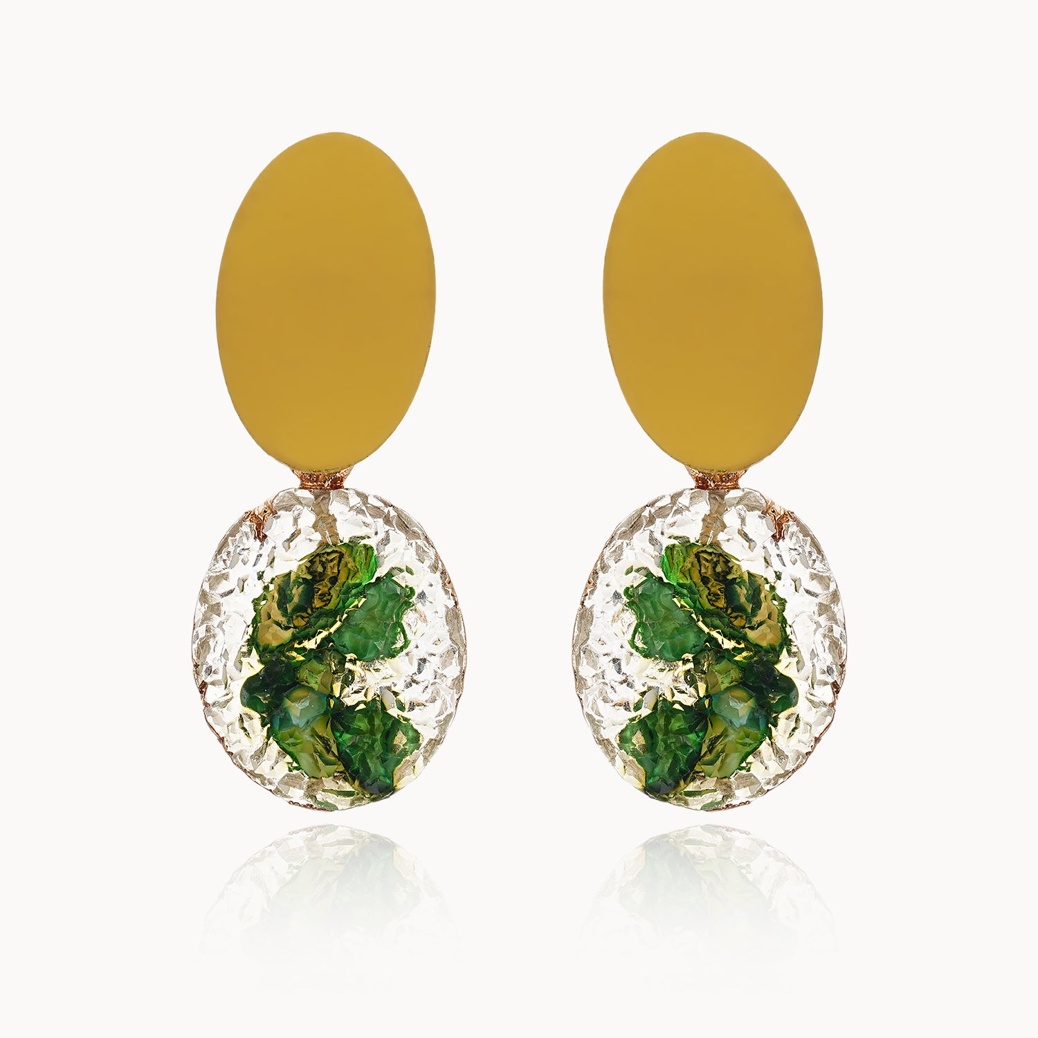The Forest Memory Earrings are a tribute to the lush beauty and tranquility of nature. Encased in clear resin, delicate green elements evoke the vibrant energy of a forest, symbolizing renewal, growth, and harmony. The design is a perfect blend of modern artistry and natural inspiration, with a golden top accent that adds elegance and sophistication. These earrings serve as a reminder of the serene and grounding presence of nature, making them a timeless accessory for any occasion.