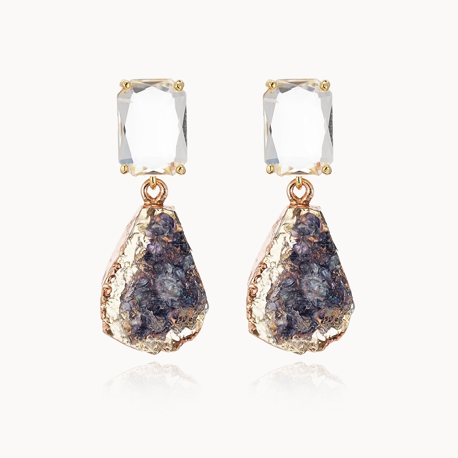 The Violet Dawn Earrings capture the serene beauty of nature’s transition from night to day. The brilliant white crystal centerpiece reflects the soft glow of morning light, while the violet hues encased in resin evoke the delicate charm of violets blooming in a tranquil garden. These earrings symbolize renewal, elegance, and the beauty of subtle beginnings, making them a timeless addition to your jewelry collection.